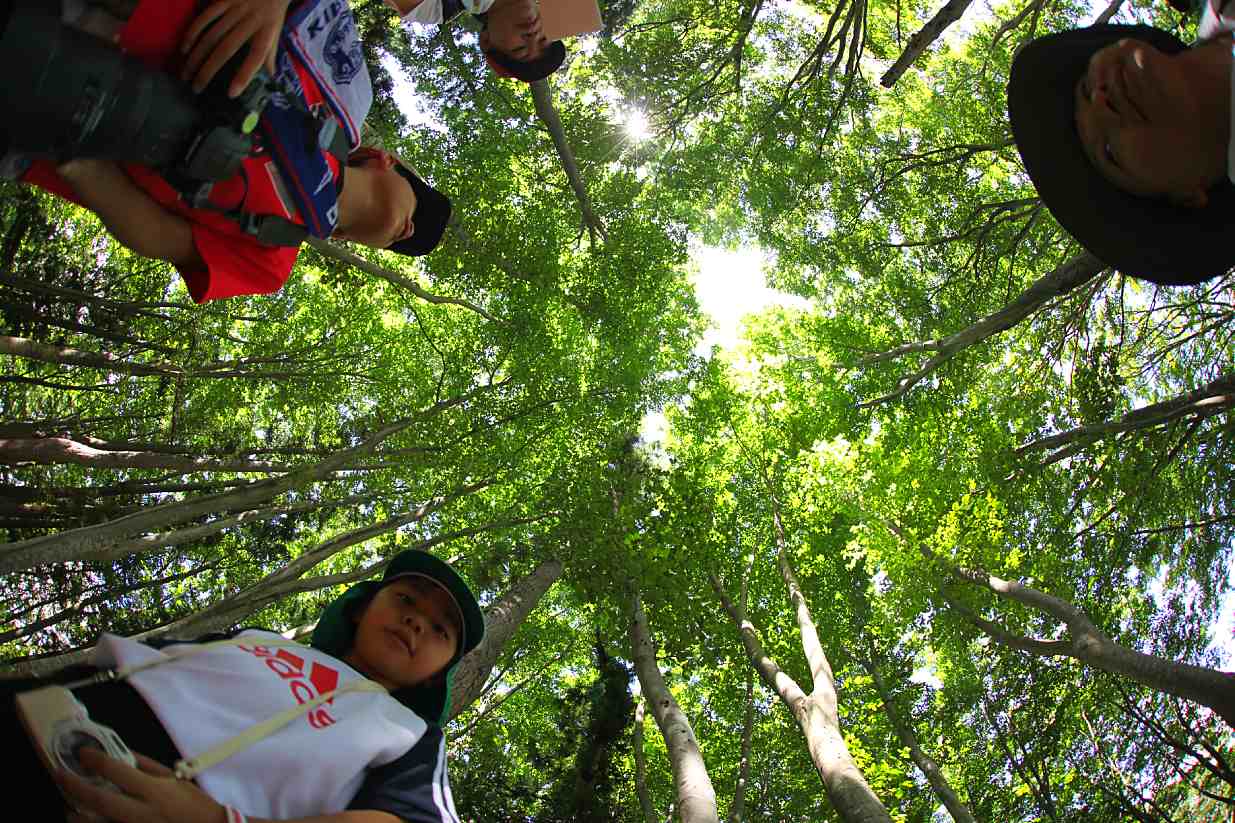 家族で長野県なべくら高原に来ていて初日はブナ林探険を体験中です。