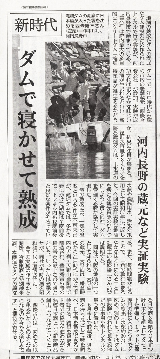 『ダム熟成酒プロジェクト』が本日産経新聞に掲載されましたのでご紹介しておきます。